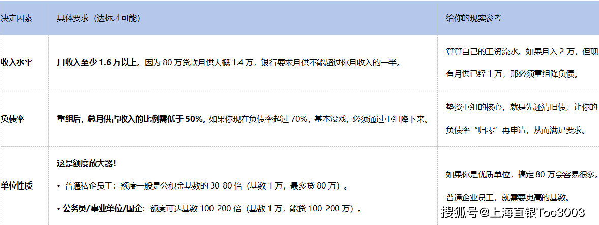 靠垫资重组搞定80万银行贷款,可行,但有严格条件。核心是你的工作收入和单位性质。这本质上是将你“稳定的未来收入”提前兑现,替换掉“混乱的高息负债”。