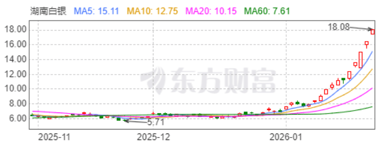 1月26日,湖南白银股价大涨。截至收盘,湖南白银上涨9.98%,收盘价为18.08元,收盘价创历史新高。近一年公司股价累计上涨409.30%。同花顺热榜数据显示,湖南白银人气值冲榜,人气排名从第10名上升至第6名,排名上升4位次。