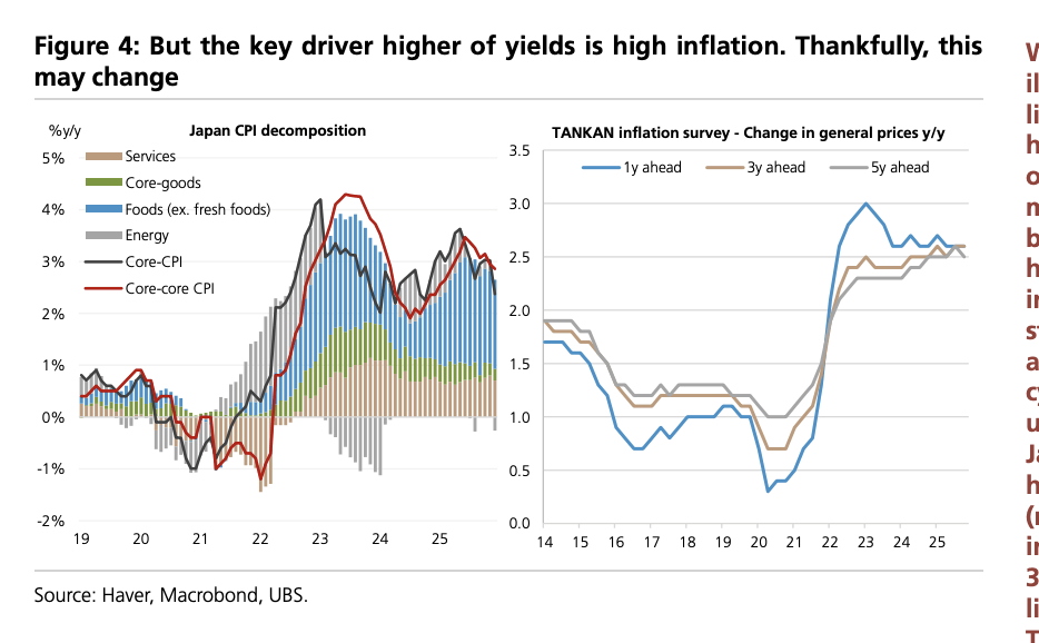 瑞银分析指出,近期日债收益率的飙升主要受市场通胀预期驱动,而非财政赤字压力。当前日本通胀主要由食品价格(如大米)等结构性因素推动,而潜在服务业通胀仍维持在约1%的温和水平。