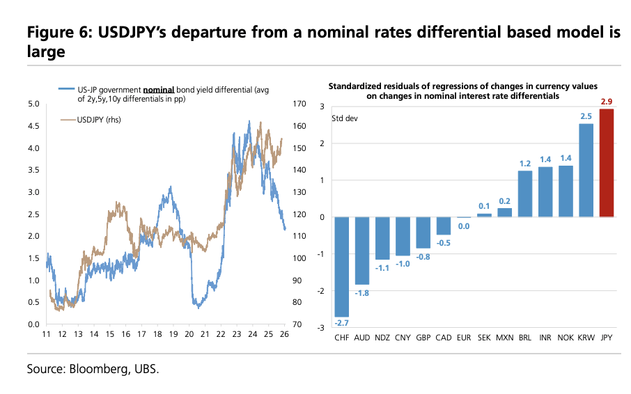 近期,日元与美日名义利率差的传统关联已经失效,实际利率差已成为其定价的核心锚点。模型显示,基于2年、5年和10年期名义利率差计算,美元兑日元的理论值应在118左右;然而,若使用实际利率差进行测算,其价值约为155,这与当前市场实际汇价高度吻合。