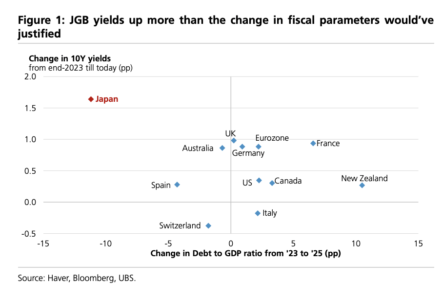 瑞银(UBS)最新全球策略报告指出,近期日本国债(JGB)收益率的急剧攀升已显著超出财政基本面可解释的范围,核心驱动来自市场对通胀预期的重新定价。该行认为,当前通胀将在年中回落至1.5%左右,这将成为日债与日元走势的关键转折点。