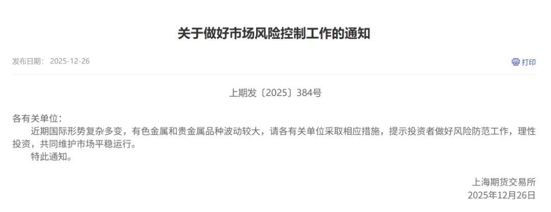 记者注意到,自12月以来,上期所针对贵金属市场行情多次发布风险提示和风控举措,引导市场理性参与:12月8日,发布针对贵金属市场的风险提示;12月10日,调整白银期货相关合约交易保证金比例和涨跌停板幅度;12月22日,调整白银期货相关合约的交易限额和交易手续费……