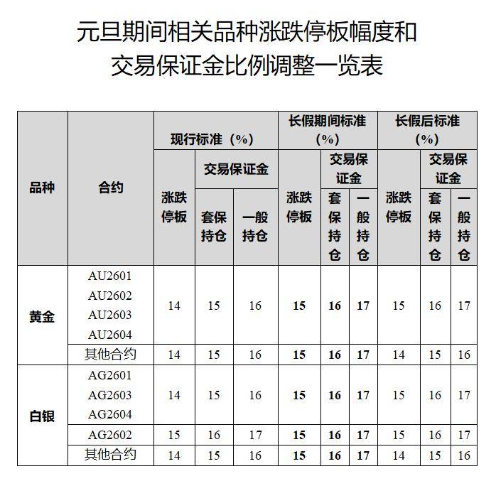 元旦假期临近,上期所同日发布《关于2026年元旦期间有关工作安排的通知》,对黄金、白银相关期货合约的涨跌停板幅度及交易保证金比例做出调整。