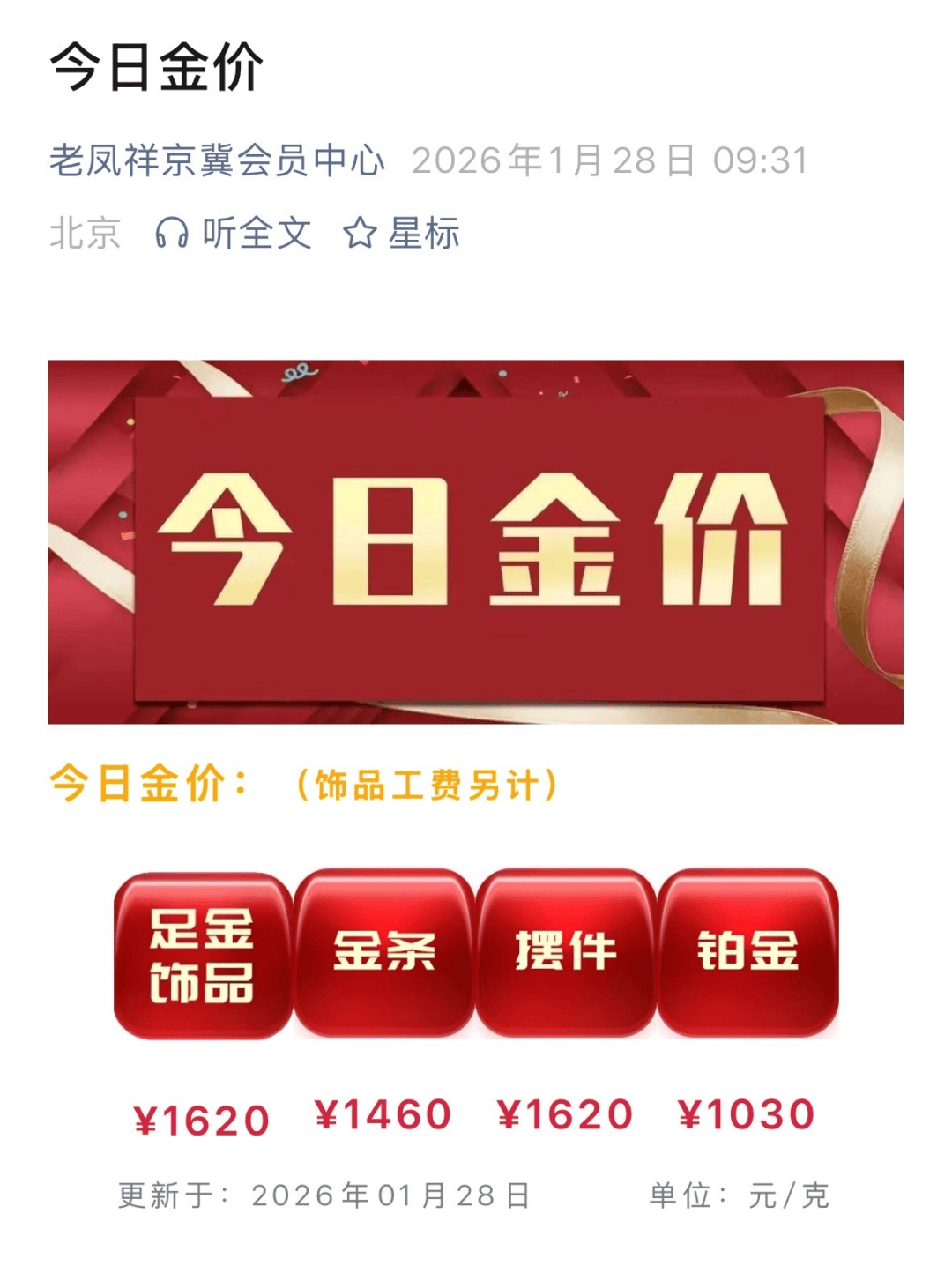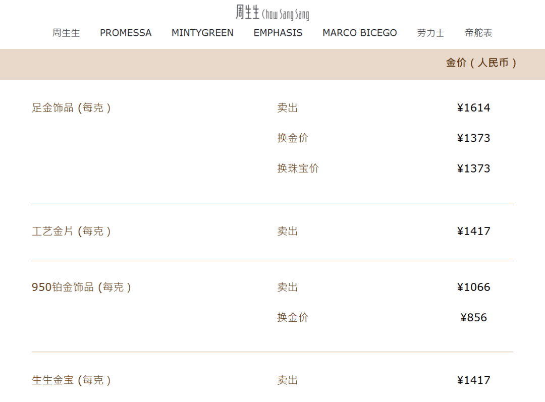 与此同时,国内多家品牌金饰克价突破1600元。其中,老凤祥黄金足金饰品报1620元/克,较前一日1576元/克涨44元;周生生足金饰品报1614元/克,较前一日1577元/克涨37元。