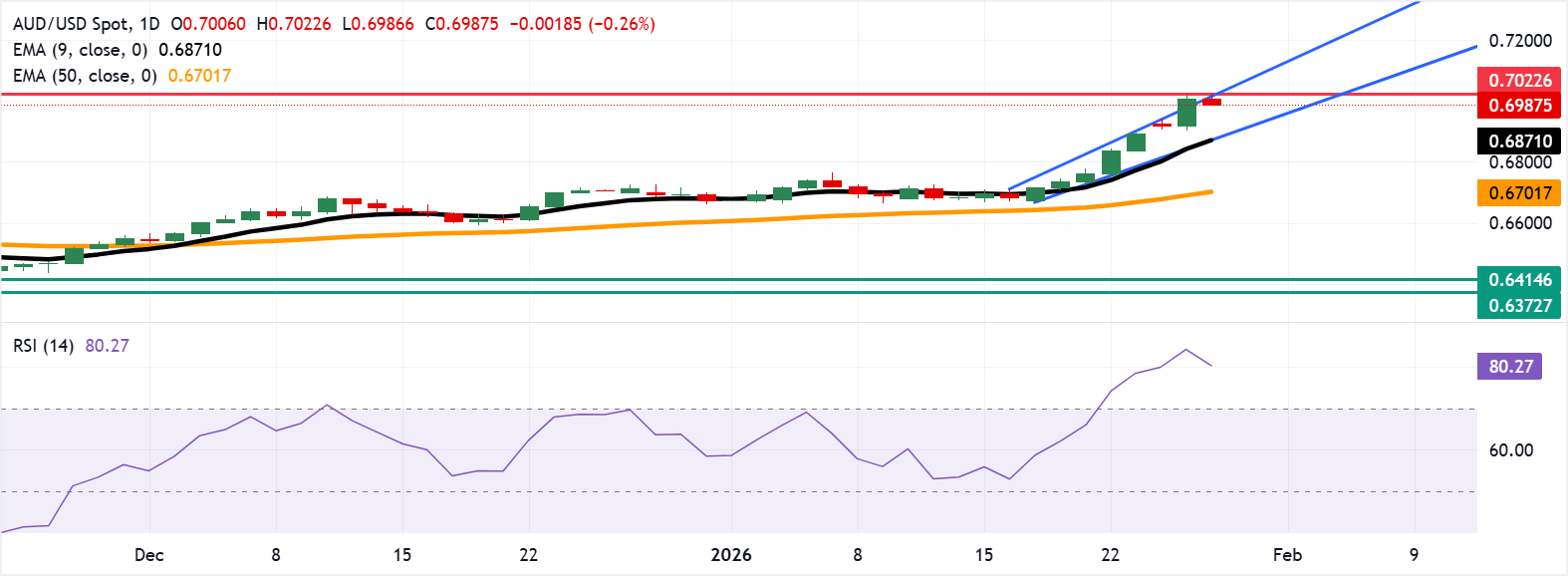 AUD/USD货币对在周三交易约为0.6990。日线图分析显示,该货币对在上升通道模式内上涨,表明持续的看涨偏向。14天相对强弱指数(RSI)为80.27,处于超买状态,发出动能过度的信号。