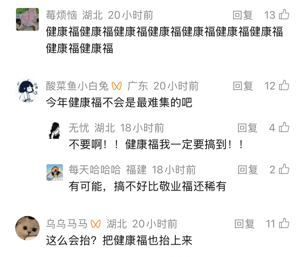 在微博、小红书等平台,相关话题迅速升温。“健康福什么时候上线”等热贴引发广泛讨论,“健康福来了吗”这一话题更是冲上微博热搜。一条“什么福都行,但最想要一张‘健康福’,送给自己和家人”的留言引发广泛共鸣,收获了高赞。