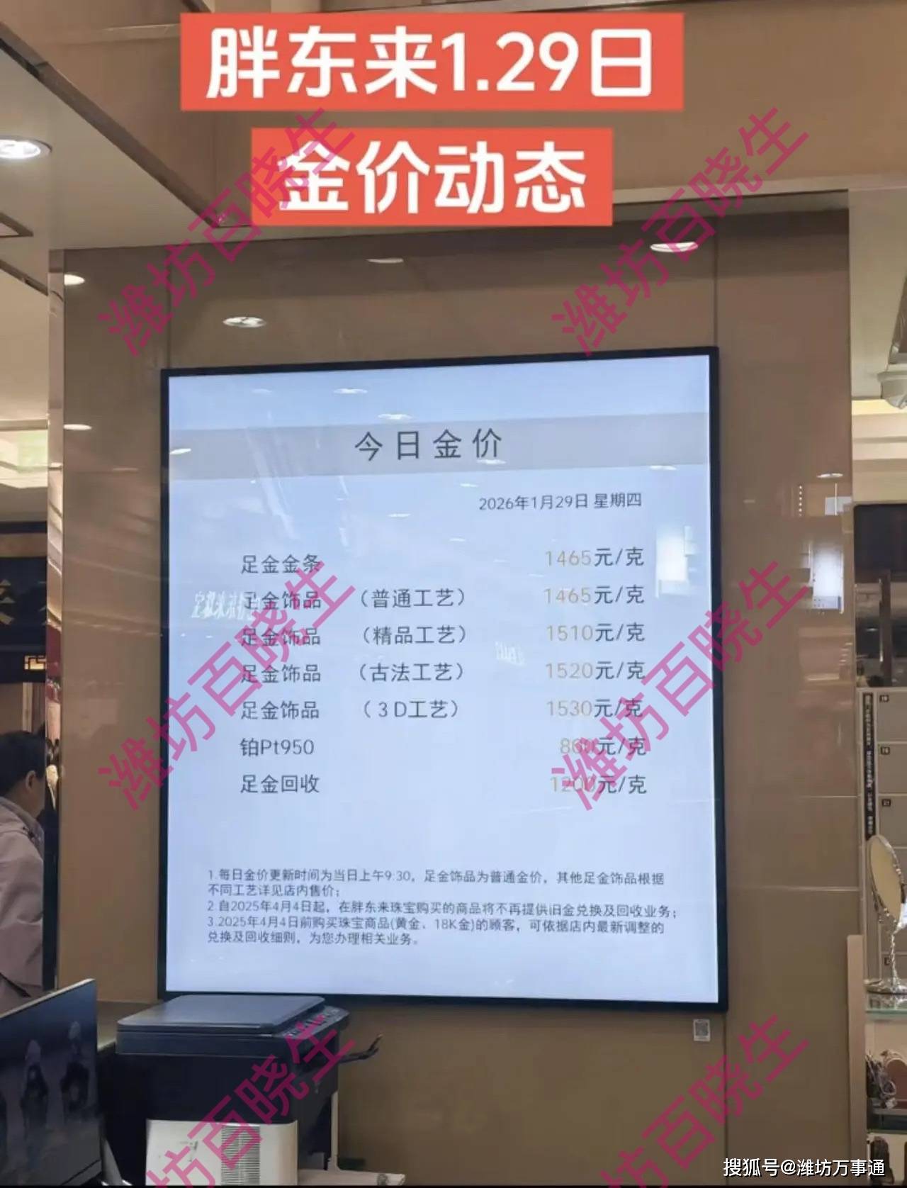 这不我们可以看到,1月29日胖东来的金价是这样。金条1465元一克,足金饰品(普通工艺)1465元一克,足金饰品(精品工艺)1510元每克。但虽然价格很高,足金的回收价才1200元每克。也就是说你在胖东来花1465元一克买了金条,然后你不想要了找胖东来回收,那价格就变成1200元每克了。