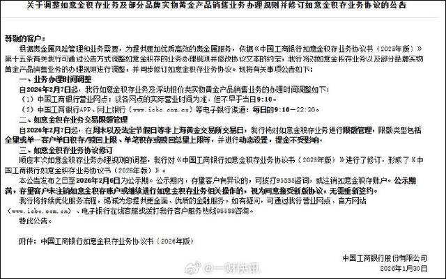 中国工商银行今日也发布公告,自2026年2月7日起,在周末以及法定节假日等非上海黄金交易所交易日,我行将对如意金积存业务进行限额管理,限额类型包括全量或单一客户单日积存/赎回上限、单笔积存或赎回总量上限等,并进行动态设置,提金不受影响。