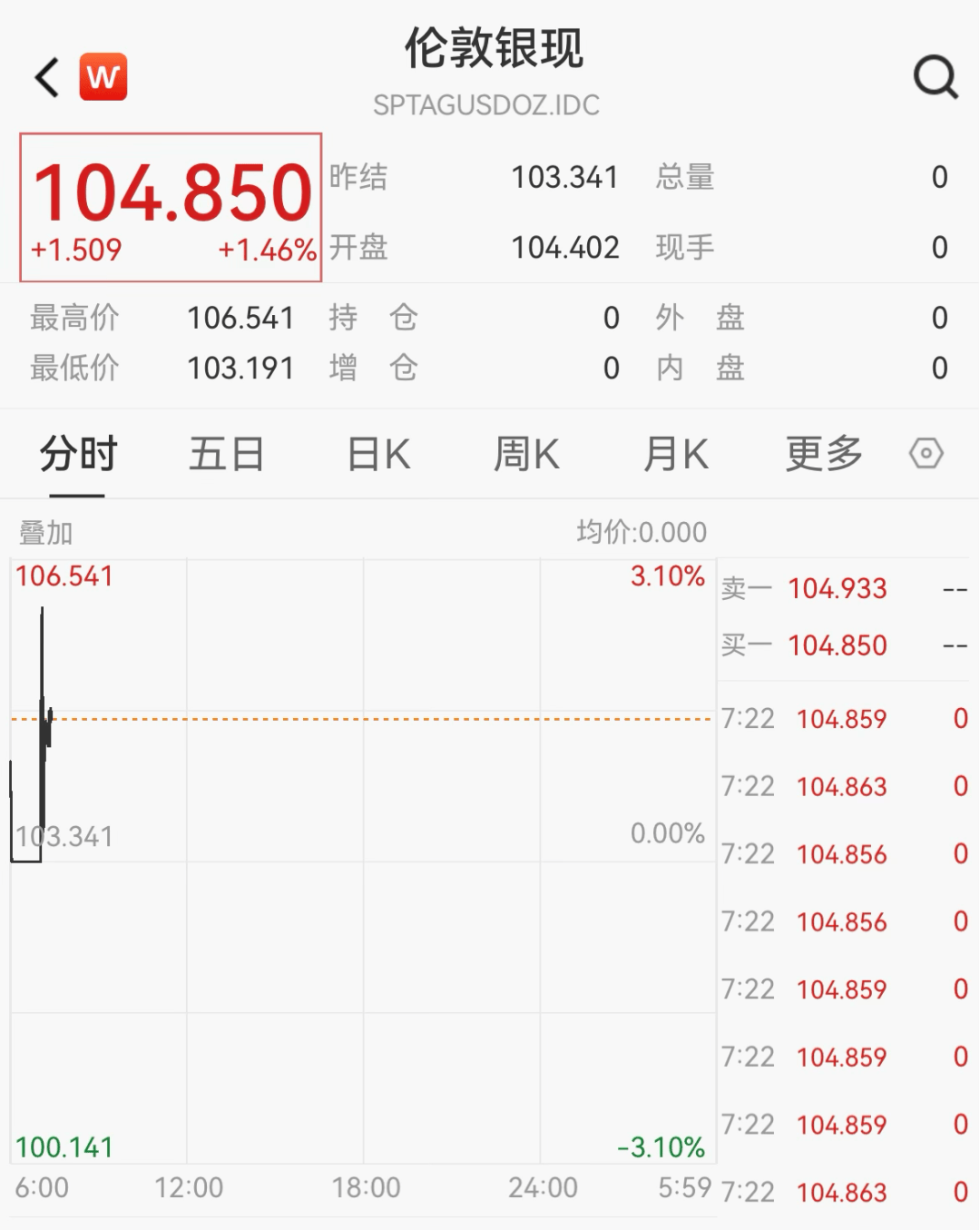 白银方面,现货白银首次突破100美元!最高价报106.541美元/盎司,创历史新高。