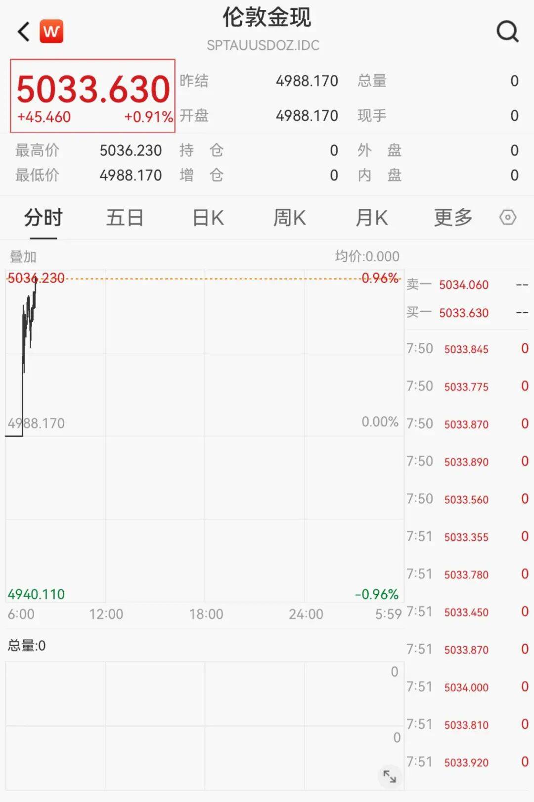 今早,现货黄金直线冲高,最高达5036.23美元/盎司,再创历史新高。
