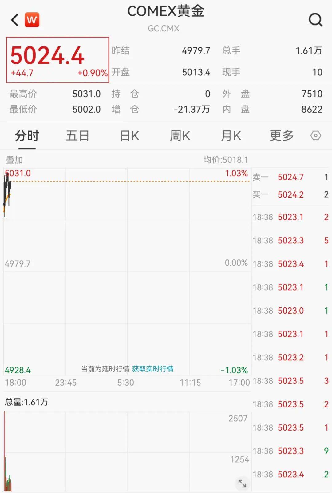 今天早上,纽约期金也突破5030美元/盎司,截至发稿报5024.4美元/盎司,日内涨0.9%