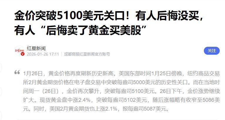 原创 金价突破5100美元关口!有人后悔没买,有人“后悔卖黄金买美股”