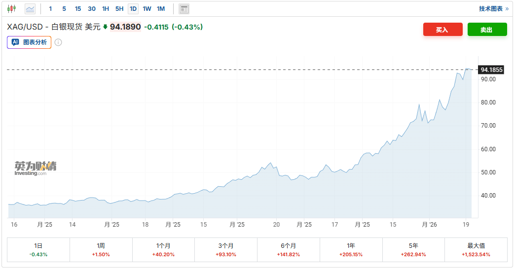 数据显示,黄金与白银在2025年实现惊人上涨后,进入2026年以后延续涨势并屡创新高。截至发稿,现货黄金涨1.55%,至4836.86美元/盎司,日内早些时候触及4844.39美元/盎司;现货白银则跌0.43%,至94.19美元/盎司,日内早些时候一度触及95.518美元/盎司。