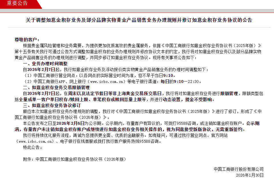 工商银行发布《关于调整如意金积存业务及部分品牌实物黄金产品销售业务办理规则并修订如意金积存业务协议的公告》。自2026年2月7日起,在周末以及法定节假日等非上海黄金交易所交易日,工商银行将对如意金积存业务进行限额管理,限额类型包括全量或单一客户单日积存/赎回上限、单笔积存或赎回总量上限等,并进行动态设置,提金不受影响。