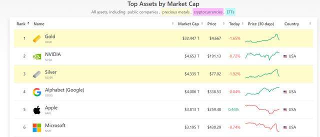 2月2日,市值数据平台Companiesmarketcap数据显示,在按市值划分的所有资产排行榜上,白银全球资产市值缩水至4.331万亿美元,黄金资产市值下跌至32.518万亿美元,目前黄金的全球市值仍排名第一,白银跌至第三位,低于第二位英伟达(NVDA.US)的4.653万亿美元。