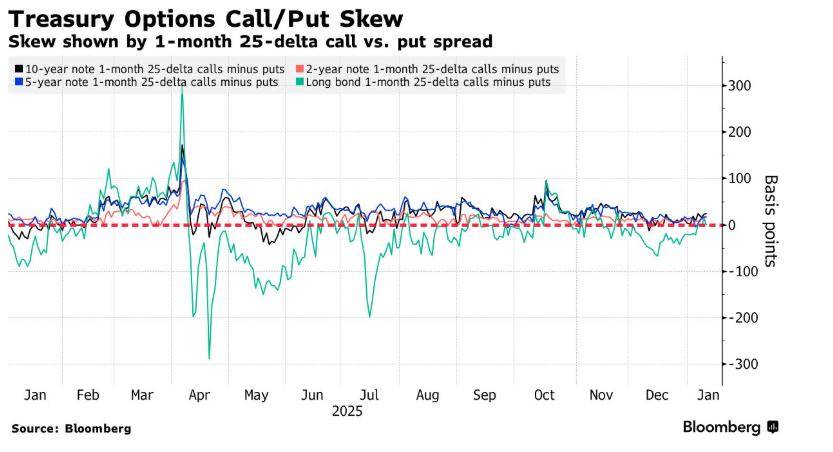 过去一周,投资者们为了对冲美国国债风险支付的溢价倾向于偏向于前端到10年期美国国债期权,而在长期国债期权中保持接近中性。这一微小的变化反映了投资者们所支付略高的溢价,以对冲2年期、5年期和10年期国债期货的债券市场上涨,而不是看跌保护或更高的收益率,这种在长期国债期权中基本保持中性,与当前市场对“美联储可能在2026年不会大幅降息”的预期一致 —— 大家只是少量对冲风险,而不是重仓押注降息。