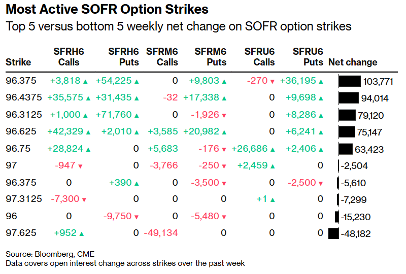 上图为最活跃的SOFR期权行权价——SOFR期权行权价的周净变化前五名与后五名。