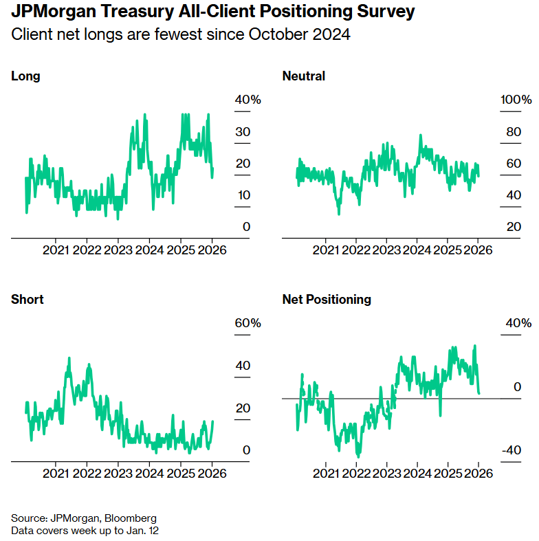 摩根大通对客户们在截至1月12日当周的仓位变化进行的一项调查显示,空头仓位增加了4个百分点,多头仓位增加了3个百分点。最后结果是自2024年10月以来的最少美国国债市场净多头仓位,出现自去年10月6日以来的最大规模空头仓位。