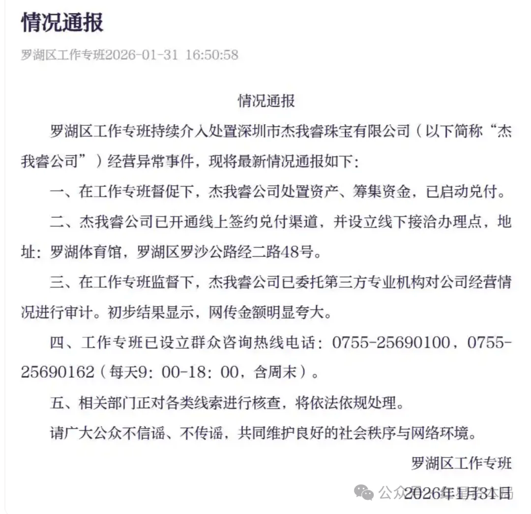 1月31日,深圳罗湖区工作专班发布情况通报,通报显示,在工作专班督促下,杰我睿公司处置资产、筹集资金,已启动兑付。在工作专班监督下,杰我睿公司已委托第三方专业机构对公司经营情况进行审计。初步结果显示,网传金额明显夸大。