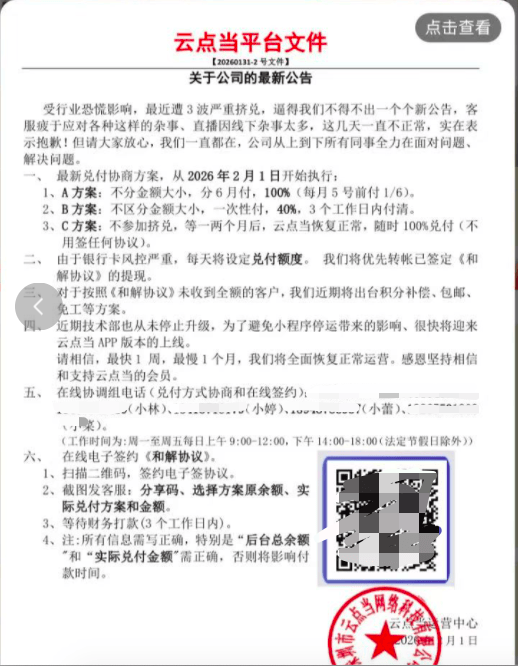 红星资本局注意到,“云点当”于2月1日在其官网发布了一则公告称,“受行业恐慌影响,最近遭3波严重挤兑”,并向用户提供了三个兑付方案:“一是不分金额大小,分6月付,100%(兑付),每月5号前付1/6;二是不区分金额大小,一次性付,40%(兑付),3个工作日内付清;三是不参加挤兑,等一两个月后,云点当恢复正常,随时100%兑付(不用签任何协议)。”