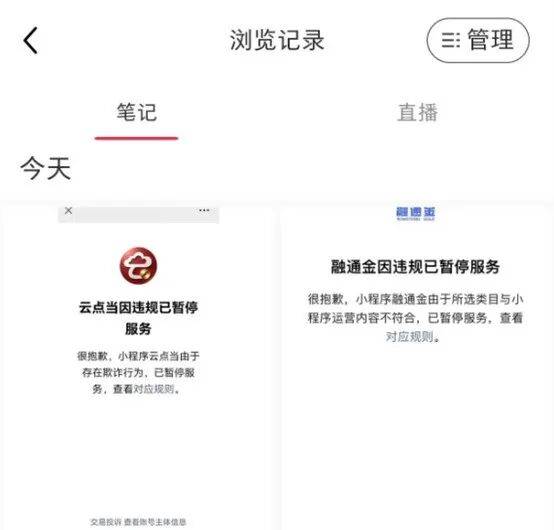 其中“云点当”显示为“违规暂停”,涉嫌“存在欺诈行为”;“融通金”被暂停的理由则是所选类目与小程序运营内容不符合。