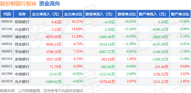 从资金流向上来看,当日股份制银行板块主力资金净流入11.33亿元,游资资金净流出7.82亿元,散户资金净流出3.51亿元。股份制银行板块个股资金流向见下表: