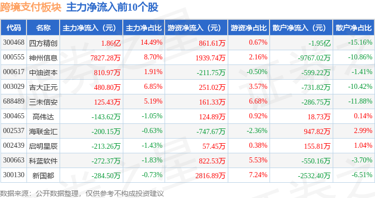 从资金流向上来看,当日跨境支付板块主力资金净流出17.91亿元,游资资金净流入6.19亿元,散户资金净流入11.71亿元。跨境支付板块个股资金流向见下表:
