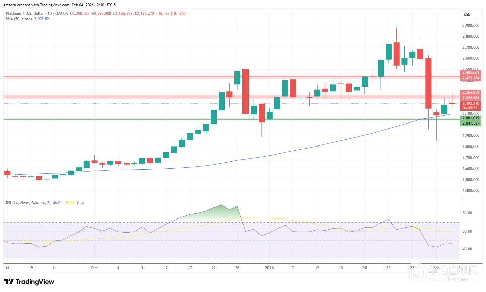 铂金未能在2245-2265美元阻力位之上企稳,回落至2200美元水平。