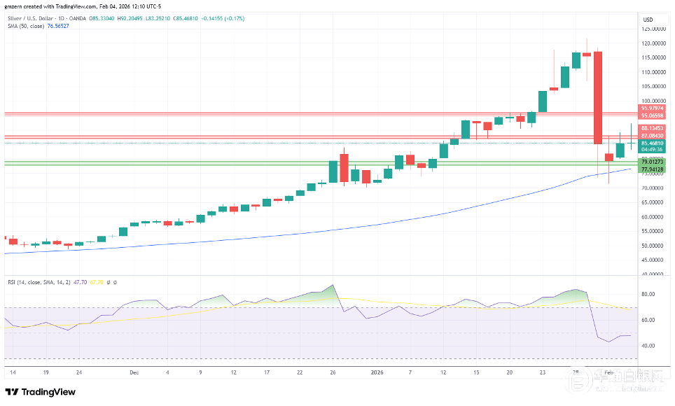 若跌破83.00美元的价位,银价将会向78.00美元至79.00美元支撑位回落。