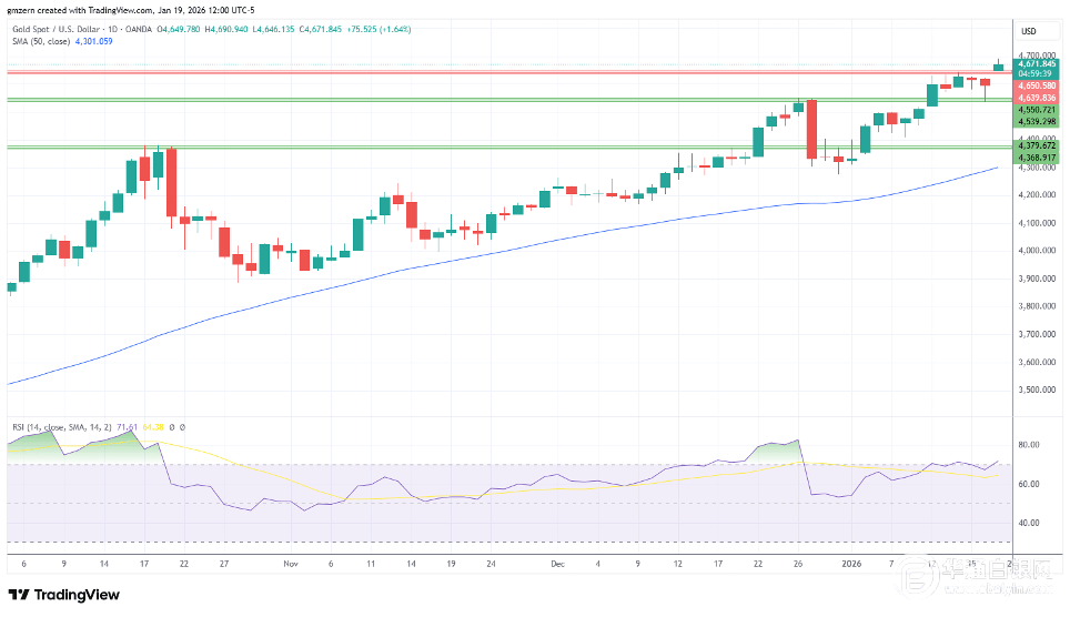 倘若黄金价格持续高于4640-4650美元阻力位,则将会向4800美元水平攀升。