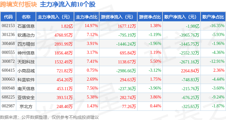 从资金流向上来看,当日跨境支付板块主力资金净流出8.36亿元,游资资金净流入1.93亿元,散户资金净流入6.43亿元。跨境支付板块个股资金流向见下表: