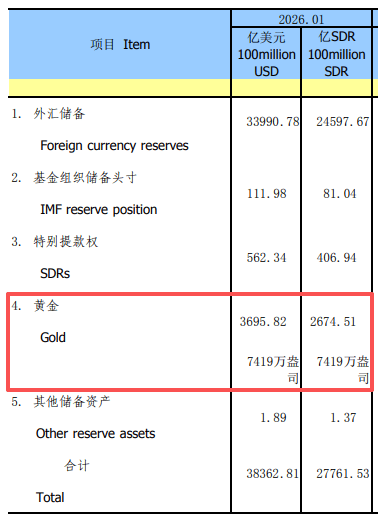 2月7日,中国人民银行发布的数据显示, 中国2026年1月末黄金储备报7419万盎司,2025年12月末为7415万盎司,为连续第15个月增持黄金。