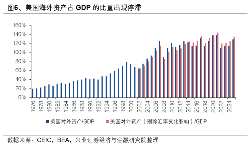 美国战略收缩降低对日本作为杠杆工具的需求。苏联解体后,美国资本的全球扩张与其软实力密切相关,而软实力又依赖于美元的中心货币地位及美军事实力等硬实力的支撑。然而,美国硬实力下降已成为现实,并已开始削弱其软实力。尽管近期美国试图通过强制性收购与军事威慑等方式对外获取资产,但这难以掩盖其对外资产扩张速度放缓的事实——从美国对外资产占GDP比重可见一斑。在此背景下,美国借助日本作为杠杆以支持其资本扩张的需求可能正在减弱。