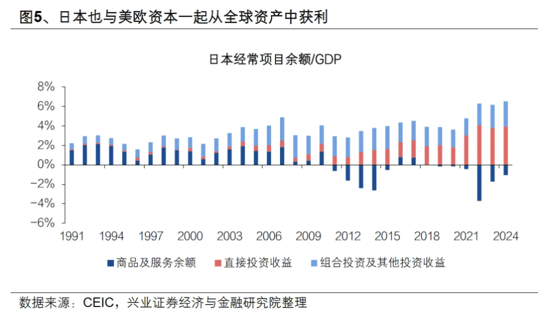 第二阶段:单极秩序时期(苏联解体后)——日本的地缘价值体现于金融领域。随着单极秩序的形成,日本作为工业与军事补给基地的重要性相对下降。与此同时,日本在战后依托美国发展起来的经济体系,在失去与美国直接竞争的能力后,其安全性反而得到提升。此外,美国通过金融资本从全球获利的意愿增强、阻力减小。日本在完成一定的资本积累后,成为资本富裕国,其长期低利率环境为美国资本提供了稳定的杠杆工具。作为回报,日本资本亦与美欧资本共同分享了全球尤其是新兴市场的发展红利。