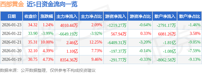 证券之星消息,截至2026年1月23日收盘,西部黄金(601069)报收于34.32元,上涨1.24%,换手率6.15%,成交量54.59万手,成交额19.18亿元。