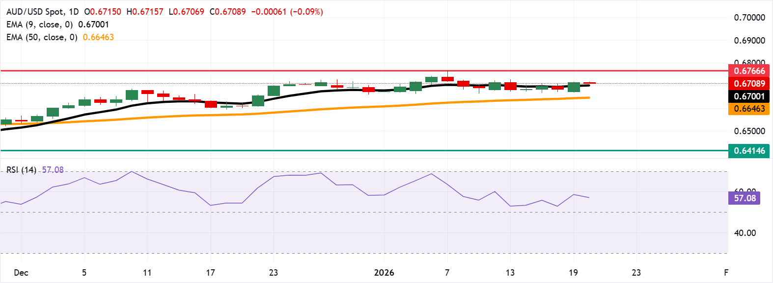 从技术面来看,澳元兑美元汇率短期内呈现上涨趋势,当前交投于0.6710附近。日线图显示,汇价在九日指数移动均线(EMA)附近震荡整理,短期走势较为中性。相对强弱指数(RSI)为56.7,表明上行动能可能增强。如果汇价维持在该均线之上,预计将测试2024年10月以来的高点0.6766。如跌破该均线,50日均线支撑位可能在0.6646附近。