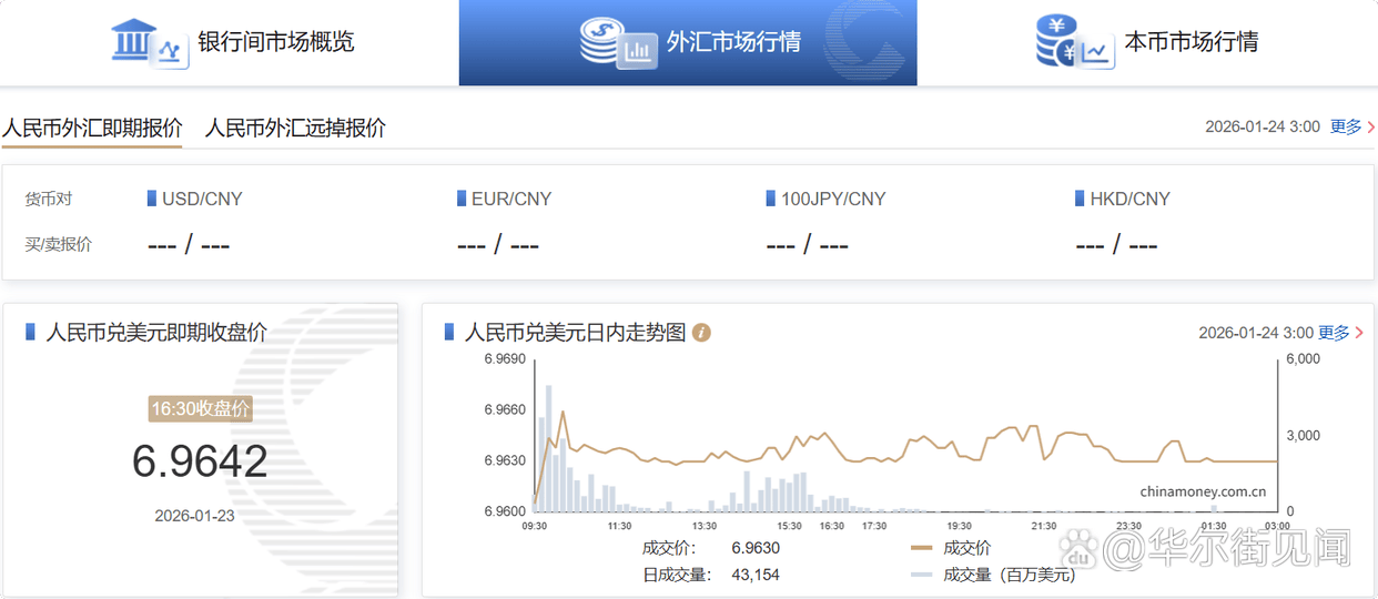 在岸人民币兑美元(CNY)北京时间03:00收报6.9630元,较周四夜盘收盘涨42点。成交量431.54亿美元。