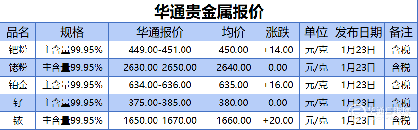 华通白银网 1月23日讯:钯粉、铑粉、铂金、钌、铱报价