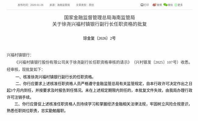 2026年1月26日,根据国家金融监督管理总局消息,《兴福村镇银行股份有限公司关于徐尧副行长任职资格审核的请示》获得通过,批复徐尧兴福村镇银行股份有限公司副行长的任职资格。