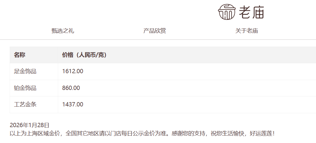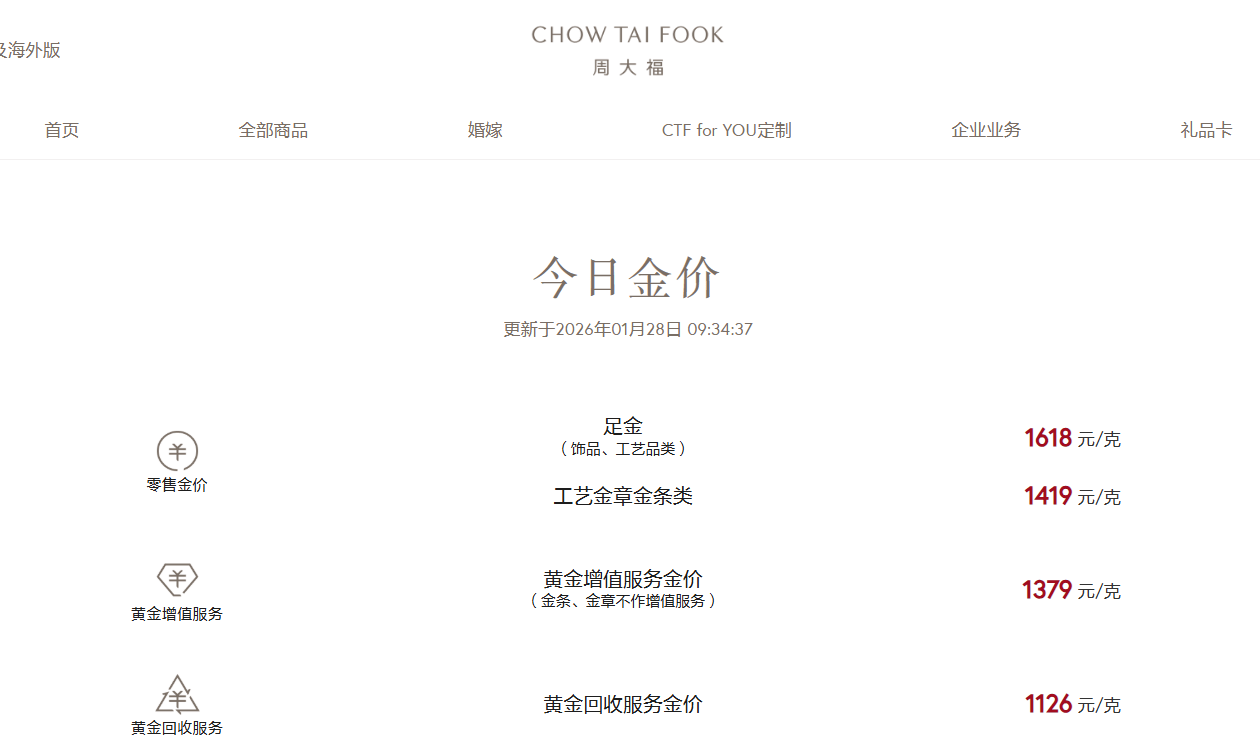 其中,周生生报价1614元/克,较前一日涨37元;周大福报价1618元/克,较前一日涨40元;老凤祥报价1620元/克,较前一日涨44元;老庙黄金报价1612元/克,较前一日涨37元。