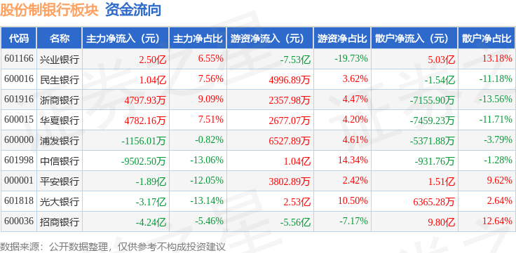 从资金流向上来看,当日股份制银行板块主力资金净流出5.86亿元,游资资金净流出7.49亿元,散户资金净流入13.35亿元。股份制银行板块个股资金流向见下表: