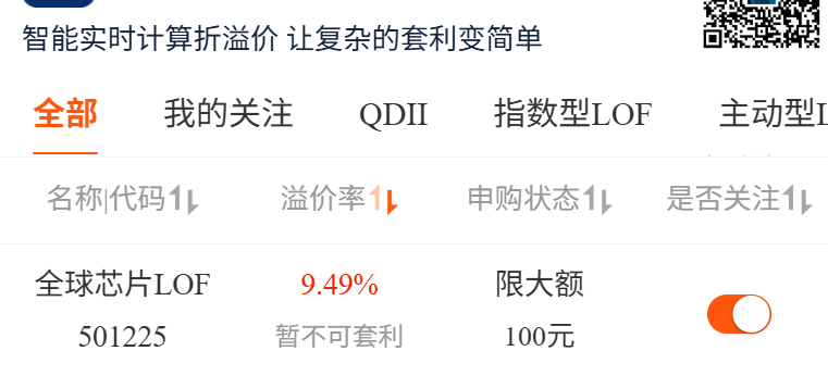 除了白银LOF,今天新增加了全球芯片的套利,溢价率9.5%左右,这时候确实稍微有点吸引力了。