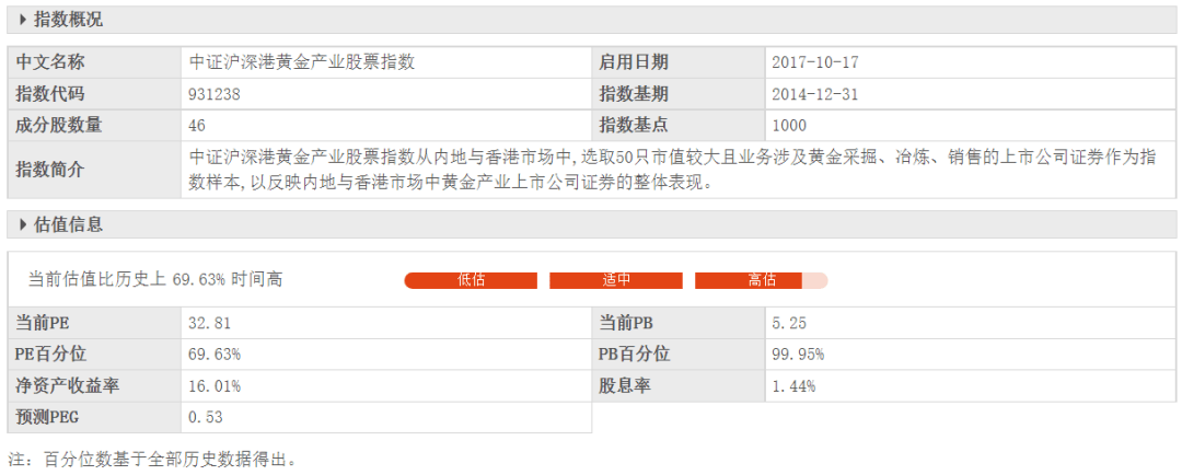 当前黄金股指数的PB估值在5.25倍,百分位99.95%,从PB估值来看,当下估值已经偏高了