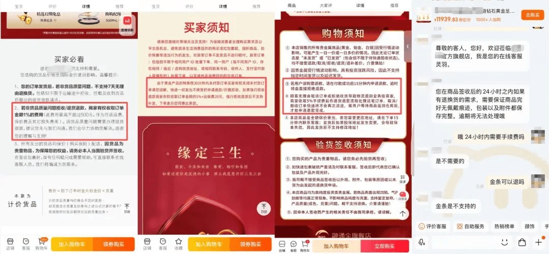 记者浏览发现,社交平台上有不少网友提及被扣款的经历,其中有人因退货金条产品被平台扣款超千元。有受访消费者表示理解黄金的投资属性,也愿意支付手续费。但还是觉得5%的比例偏高,且其申请退款时平台并未明显提醒称要扣手续费(退货规则一般在商品详情页中)。