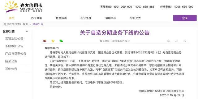 光大银行于2025年10月22日发布公告,宣布自12月9日(含)起正式下线信用卡“自选分期”功能,对已开通该功能的信用卡统一关闭,新入账交易不再进行自动分期处理。