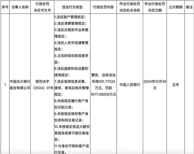 2024年12月,光大银行总行因违反账户管理、反洗钱等十一项规定,被央行没收违法所得201.77万元,并处以罚款1677.06万元,12名相关责任人同步被追责。