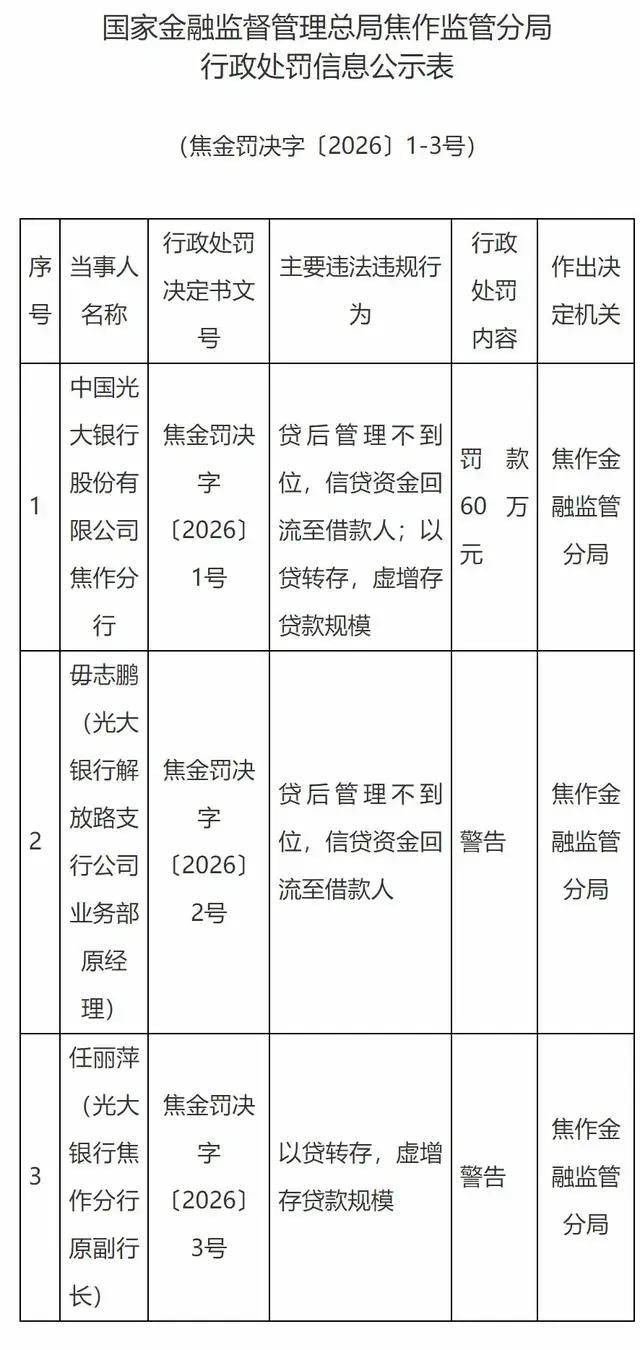 国家金融监督管理总局焦作监管分局近日披露,光大银行焦作分行因贷后管理缺位、信贷资金回流借款人,以及以贷转存虚增存贷款规模两项违规,被罚60万元,两名相关责任人同步被警告。