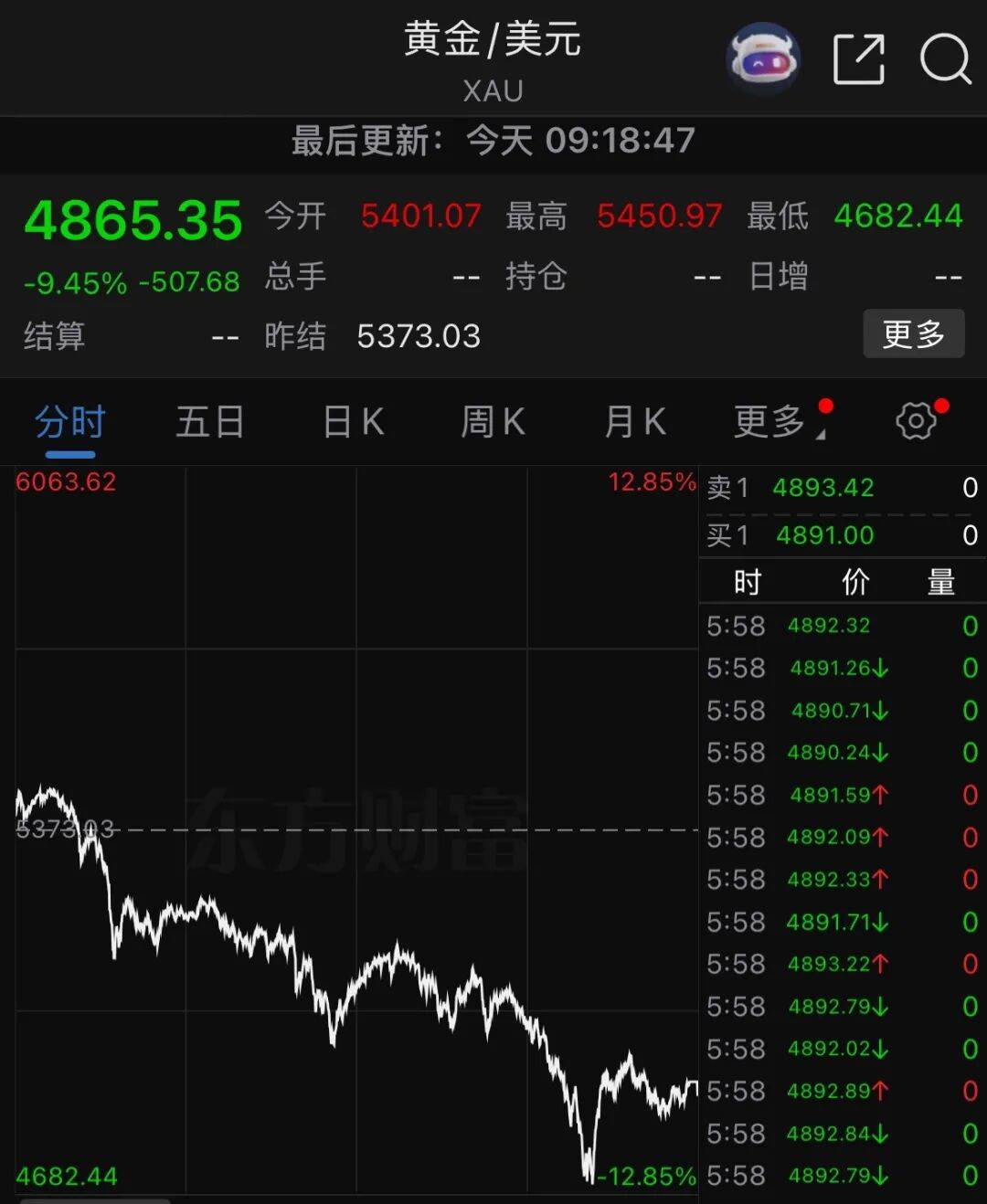 截至1月31日9:18,现货黄金报4865美元,跌幅9.45%。现货白银报84.70美元,跌幅 26.77%。