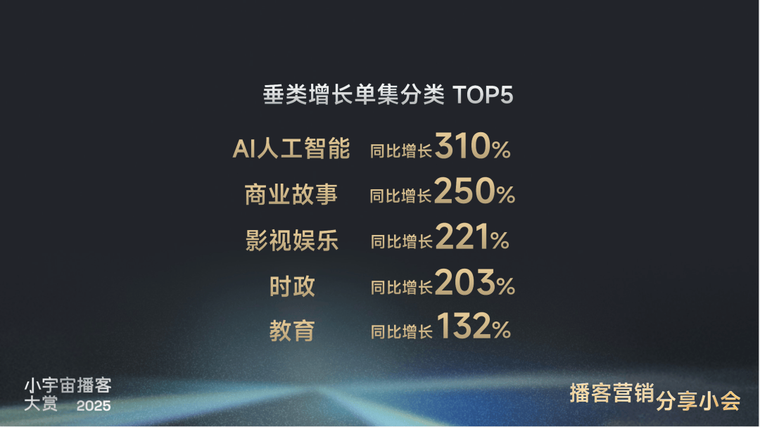 小宇宙市场品牌总监米肉介绍,小宇宙在接下来的一年里会尝试探索更多的场景。首先,播客是新概念的一线发布会,越来越多商业和产品发布,将通过播客、通过小宇宙与它的受众见面,品牌的创始人可能会在播客里有更深刻的表达、对产品有更完整的解析。在过去一年里,最受关注的AI人工智能类节目同比增长310%,商业故事类增长250%。