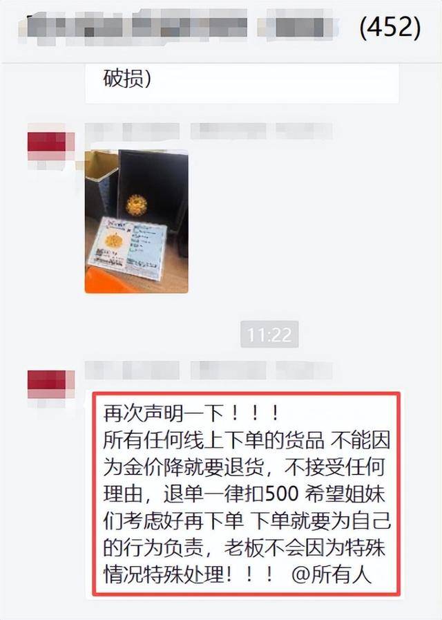 记者发现,有黄金品牌柜台销售人员在社群中发布声明称:不能因为金价降了就要退货,不接受任何理由,退单一律扣500元。据了解,实体金店一般购买离柜后就不接受退款退货。